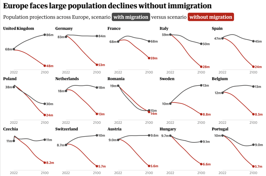 Europe currently has a population of 447 million, which is set to decline to 419 million by 2100, despite immigration offseting the falling birthrates. However, with centrist parties bowing to the the increasing pressure from far-right Reform UK, Germany’s AfD, France’s National Rally, Portugal’s Chega, Spain’s Vox and other bad actors in every European country on the continent, there is a very real possibility that immigration to Europe could fall to zero or even reverse and go negative as immigrants like me return home to escape rising xenophobia, violence, and tightening regulations like Portugal’s Nationality Law and Immigration Law. In this zero immigration scenario, the population of Europe will fall from 447 million today to under 295 million by 2100.